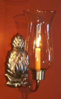 The pineapple, a traditional symbol of hospitality, once graced colonial tables. Let this same symbol grace your wall. The sconce is of solid brass, and is lacquered to maintain it's shine for years to come. The hurricane glass (included) protects flames from drafts. This sconce weighs 1 pound 13 ounces without the glass. Available in polished brass, or our silver or pewter finishes.