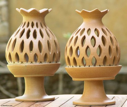 NOVICA, in association with National Geographic, offers thousands of limited edition and one-of-a-kind gifts, jewelry, and home decor treasures handmade by master artists and artisans throughout the world. Delicate latticework in warm ceramic characterizes these delightful candleholders from Putu Oja Mahendra. Crafted on a potter's wheel, the candleholders evoke the tropical beauty of Bali. Artisan Info: Putu Oka Mahendra was born in the Tabanan regency of Bali on June 12, 1966. His mother, Made Tantri, pioneered ceramic artistry in 1980. She was a woman full of energy and highly self-confident. When she first started she undertook the entire crafting procedure by herself - from creating the design until finishing the product. She gradually developed a reputation for fine design and high quality and people started placing so many orders that she saw the need to hire assistants. In 1990, when Tantri passed away, Oka Mahendra took-over her work, and eventually opened a showroom in her memory. To create his designs, Oka Mahendra finds inspiration in the luscious flora and fauna of Bali. In 1993, he was the third place winner for his ceramic designs in the Lomba Ceramic Design contest. Oka Mahendra has exhibited his hand-crafted items at the Asian Trade Fair (ATF) at Jakarta in 1993 and participated in exhibits in Jakarta (1995 and 2000), Bali (1997-1998) and recently at the Korean and Hong Kong Embassies in Jakarta (2001).